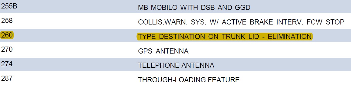 260 TYPE DESTINATION ON TRUNK LID - ELIMINATION