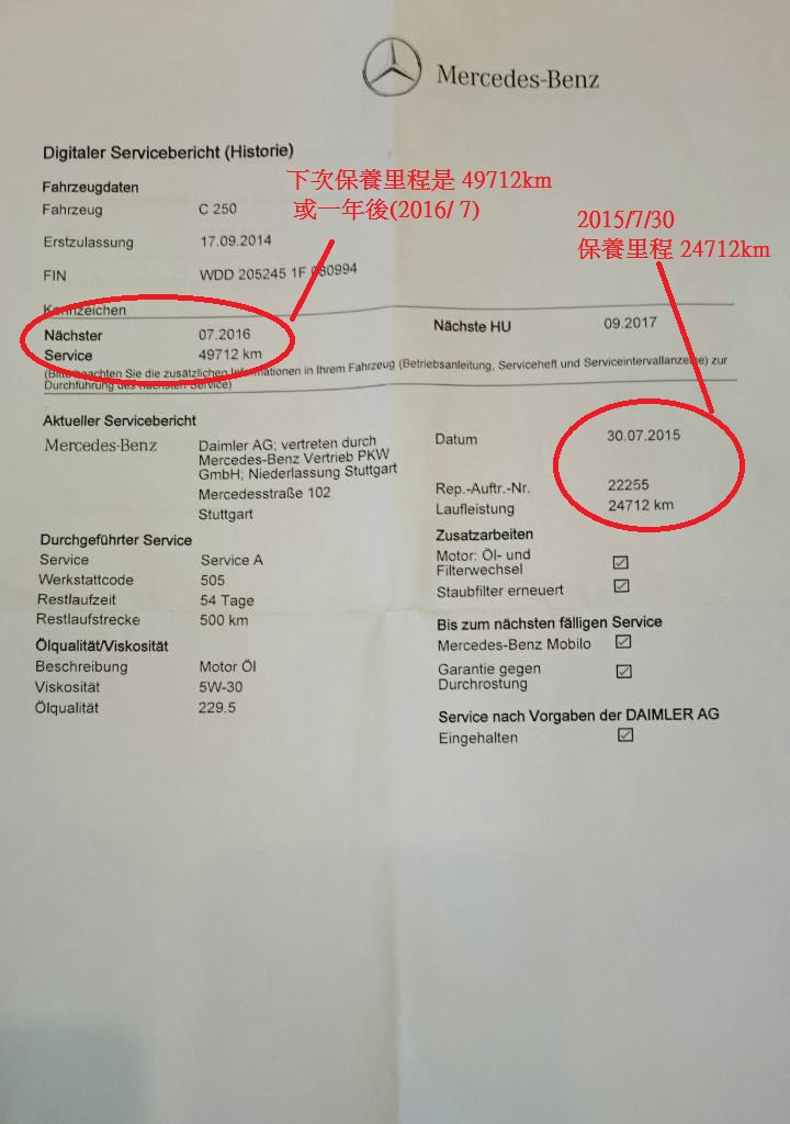 P.S 附上德國原廠的保養工單列表,上面記載該車在 2015/7/30 保養里程是 24712km,下次